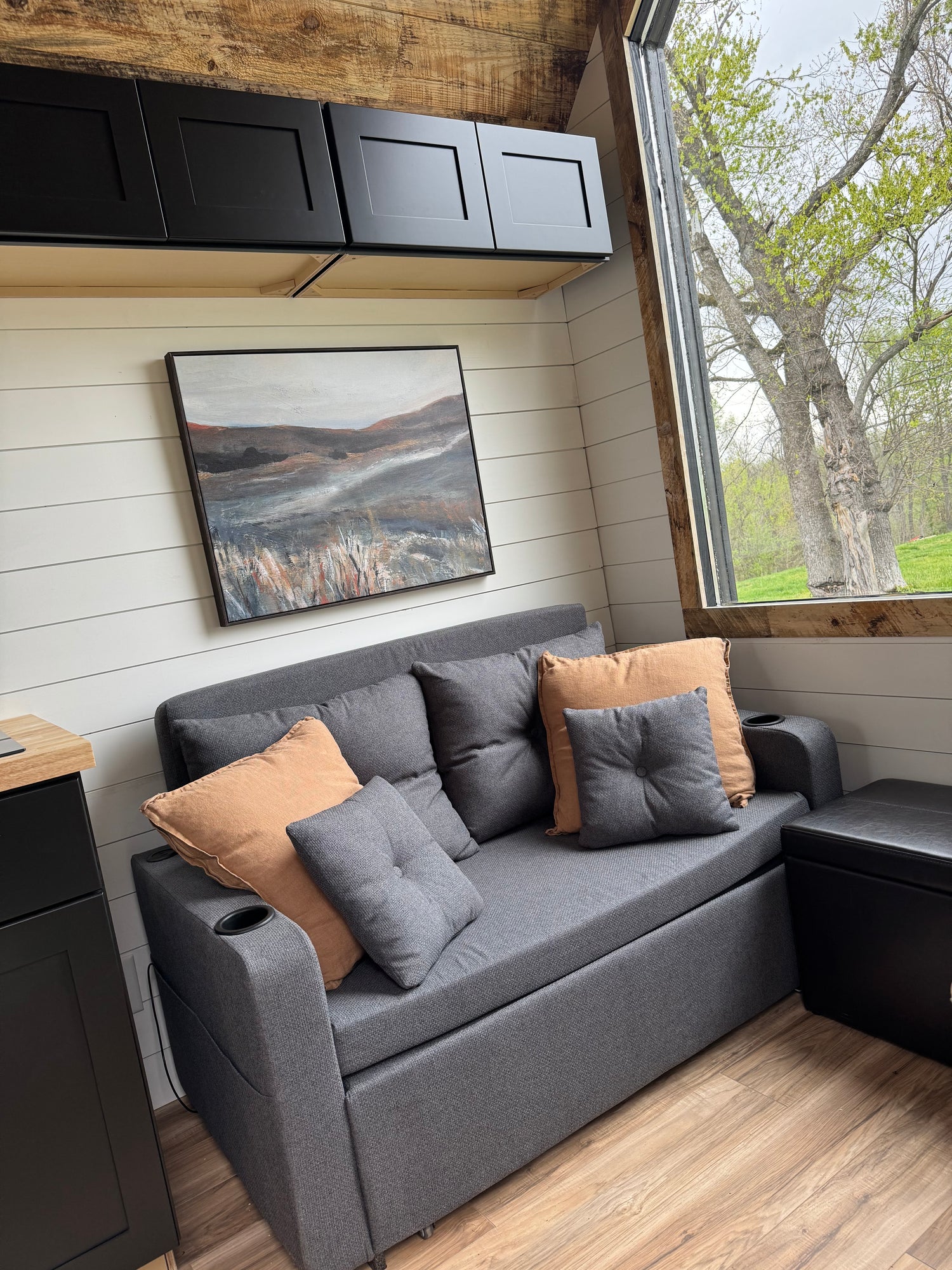 Handcrafted and designed with you in mind. All of the comforts of home in a small package. All of our homes have the option of a living room, kitchen, sink, cooktop, refrigerator, sleeping space, dining table, office space, TV, and a bathroom!